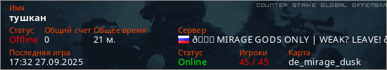 Играет на Counter Strike Global Offensive сервере. Страна: РоссияПервый раз замечен 18:34 20.09.2025
