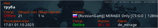 Играет на Counter Strike Global Offensive сервере. Страна: РоссияПервый раз замечен 20:01 22.09.2025
