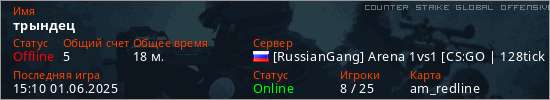 Играет на Counter Strike Global Offensive сервере. Страна: РоссияПервый раз замечен 19:01 18.05.2025