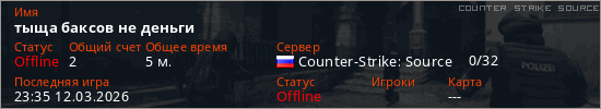 Играет на Counter Strike Source сервере. Страна: РоссияПервый раз замечен 23:06 12.03.2026