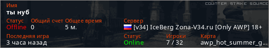 Играет на Counter Strike Source сервере. Страна: РоссияПервый раз замечен 12:29 02.03.2026