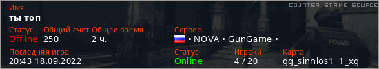 Играет на Counter Strike Source сервере. Страна: РоссияПервый раз замечен 21:00 16.09.2022