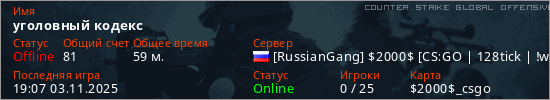 Играет на Counter Strike Global Offensive сервере. Страна: РоссияПервый раз замечен 19:53 23.10.2025