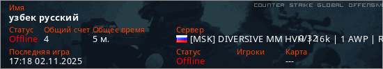 Играет на Counter Strike Global Offensive сервере. Страна: РоссияПервый раз замечен 16:50 02.11.2025