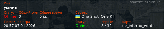 Играет на Counter Strike 1.6 сервере. Страна: УкраинаПервый раз замечен 20:54 07.01.2026