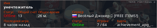 Играет на Team Fortress 2 сервере. Страна: РоссияПервый раз замечен 22:17 07.03.2026