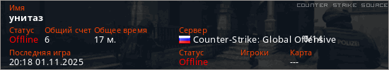 Играет на Counter Strike Source сервере. Страна: РоссияПервый раз замечен 15:54 28.10.2025