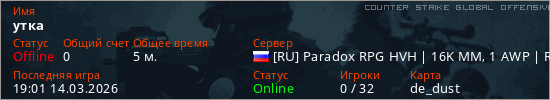Играет на Counter Strike Global Offensive сервере. Страна: РоссияПервый раз замечен 18:51 14.03.2026