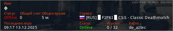 Играет на Counter Strike Source сервере. Страна: РоссияПервый раз замечен 09:04 13.12.2025