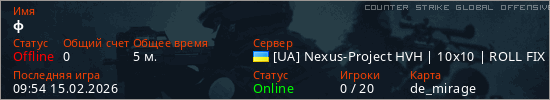 Играет на Counter Strike Global Offensive сервере. Страна: УкраинаПервый раз замечен 09:33 15.02.2026