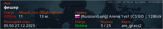 Играет на Counter Strike Global Offensive сервере. Страна: РоссияПервый раз замечен 14:26 26.12.2025