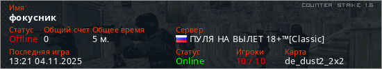 Играет на Counter Strike 1.6 сервере. Страна: РоссияПервый раз замечен 13:17 04.11.2025