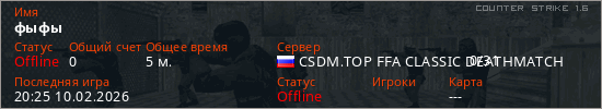 Играет на Counter Strike 1.6 сервере. Страна: РоссияПервый раз замечен 20:23 10.02.2026