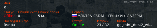 Играет на Counter Strike 1.6 сервере. Страна: РоссияПервый раз замечен 23:19 11.01.2026