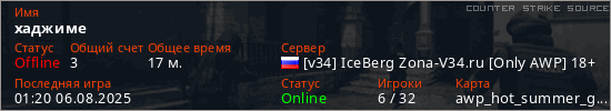 Играет на Counter Strike Source сервере. Страна: РоссияПервый раз замечен 14:44 05.08.2025