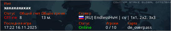 Играет на Counter Strike Global Offensive сервере. Страна: РоссияПервый раз замечен 13:03 14.11.2025