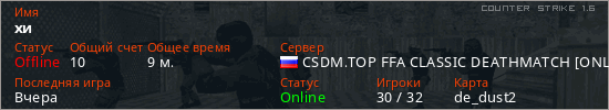 Играет на Counter Strike 1.6 сервере. Страна: РоссияПервый раз замечен 22:28 24.04.2026