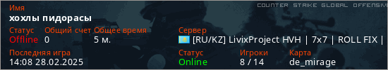 Играет на Counter Strike Global Offensive сервере. Страна: КазахстанПервый раз замечен 14:00 28.02.2025