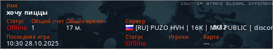 Играет на Counter Strike Global Offensive сервере. Страна: РоссияПервый раз замечен 15:24 25.10.2025