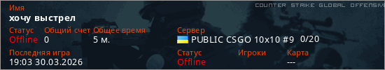 Играет на Counter Strike Global Offensive сервере. Страна: УкраинаПервый раз замечен 18:55 30.03.2026