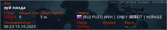 Играет на Counter Strike Global Offensive сервере. Страна: РоссияПервый раз замечен 00:18 15.10.2025