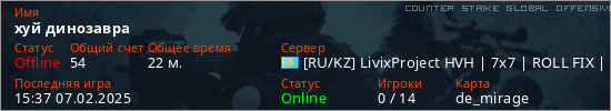 Играет на Counter Strike Global Offensive сервере. Страна: КазахстанПервый раз замечен 14:57 02.02.2025