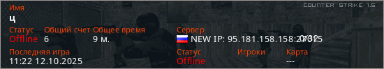 Играет на Counter Strike 1.6 сервере. Страна: РоссияПервый раз замечен 11:11 12.10.2025