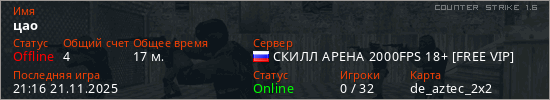 Играет на Counter Strike 1.6 сервере. Страна: РоссияПервый раз замечен 20:25 19.01.2025