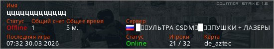 Играет на Counter Strike 1.6 сервере. Страна: РоссияПервый раз замечен 07:26 30.03.2026