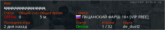 Играет на Counter Strike 1.6 сервере. Страна: РоссияПервый раз замечен 09:25 15.03.2026