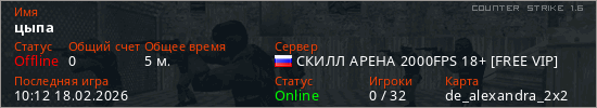 Играет на Counter Strike 1.6 сервере. Страна: РоссияПервый раз замечен 10:10 18.02.2026