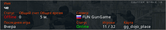 Играет на Counter Strike 1.6 сервере. Страна: РоссияПервый раз замечен 17:11 11.03.2026