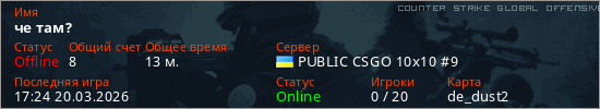 Играет на Counter Strike Global Offensive сервере. Страна: УкраинаПервый раз замечен 18:46 06.03.2026