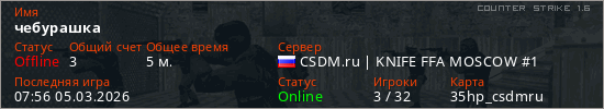 Играет на Counter Strike 1.6 сервере. Страна: РоссияПервый раз замечен 07:54 05.03.2026