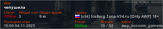 Играет на Counter Strike Source сервере. Страна: РоссияПервый раз замечен 10:25 04.11.2025