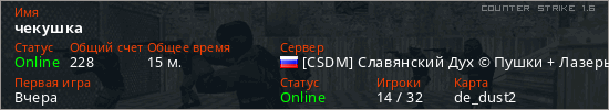 Играет на Counter Strike 1.6 сервере. Страна: РоссияПервый раз замечен 15:54 24.12.2025