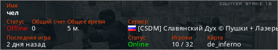 Играет на Counter Strike 1.6 сервере. Страна: РоссияПервый раз замечен 12:20 10.04.2026