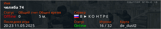 Играет на Counter Strike 1.6 сервере. Страна: РоссияПервый раз замечен 20:20 11.05.2025