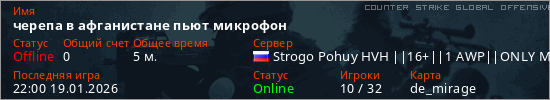 Играет на Counter Strike Global Offensive сервере. Страна: РоссияПервый раз замечен 21:56 19.01.2026