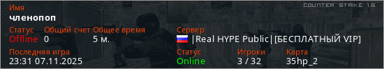 Играет на Counter Strike 1.6 сервере. Страна: РоссияПервый раз замечен 22:49 07.11.2025