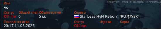 Играет на Counter Strike Global Offensive сервере. Страна: РоссияПервый раз замечен 19:58 11.03.2026