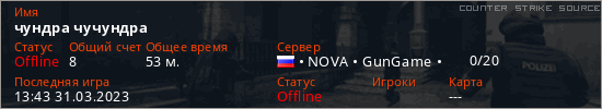 Играет на Counter Strike Source сервере. Страна: РоссияПервый раз замечен 10:25 08.03.2023