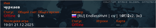 Играет на Counter Strike Global Offensive сервере. Страна: РоссияПервый раз замечен 18:34 21.12.2025