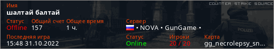 Играет на Counter Strike Source сервере. Страна: РоссияПервый раз замечен 06:22 27.10.2022