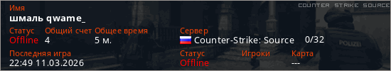 Играет на Counter Strike Source сервере. Страна: РоссияПервый раз замечен 22:47 11.03.2026
