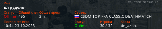 Играет на Counter Strike 1.6 сервере. Страна: РоссияПервый раз замечен 08:24 13.08.2022