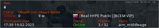 Играет на Counter Strike 1.6 сервере. Страна: РоссияПервый раз замечен 21:26 16.01.2025