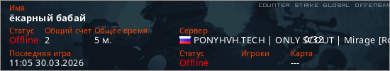 Играет на Counter Strike Global Offensive сервере. Страна: РоссияПервый раз замечен 10:52 30.03.2026