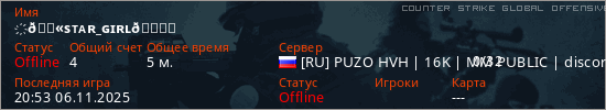 Играет на Counter Strike Global Offensive сервере. Страна: РоссияПервый раз замечен 20:43 06.11.2025