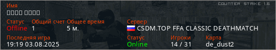 Играет на Counter Strike 1.6 сервере. Страна: РоссияПервый раз замечен 19:13 03.08.2025